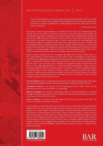 This volume contains the proceedings of a conference held in 2022 at the Archaeological Park of Ostia Antica on the effects of seismicity in Ostia Antica and other centres of Roman Italy. The contributions are grouped according to several major themes. After a methodological introduction (part 1), they address the general problem of seismic activity in Ostia (part 2), and then go into more detail on individual monuments (part 3). Further essays deepen our understanding of the characteristics and geo-seismological events of the ancient Ostiense territory (part 4). In parts 5 and 6, contributions discuss archaeoseismology in Rome, Pompeii, and Herculaneum, as well as select territories of Roman Spain. One chapter also examines the anthropology and oral history of natural disasters. A concluding chapter, written by the director of the Archaeological Park of Ostia Antica, outlines key takeaways from the conference, and outlines future avenues of research. Questo volume raccoglie gli atti di un convegno sugli effetti della sismicità a Ostia Antica e in altri centri dell'Italia romana tenutosi nel 2022 presso il Parco Archeologico di Ostia Antica. I contributi sono raggruppati secondo alcuni temi principali. Dopo un'introduzione metodologica (parte 1), affrontano il problema dell'avvenimento sismico a Ostia prima da un punto di vista generale (parte 2), per poi entrare più in dettaglio su un gruppo di singoli monumenti di Ostia (parte 3). Altri saggi approfondiscono la comprensione delle caratteristiche e degli eventi geo-sismologici dell'antico territorio Ostiense (parte 4). Nelle parti 5 e 6, ulteriori capitoli discutono l'archeosismologia a Roma, Pompei ed Ercolano, nonché in particolari territori della Spagna romana. Un capitolo esamina anche l'antropologia e la storia orale dei disastri naturali. Un capitolo conclusivo, scritto dal direttore del Parco Archeologico di Ostia Antica, delinea i punti chiave del convegno e delinea le future strade di ricerca.