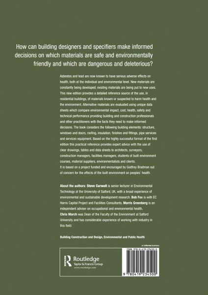 This new edition provides a detailed reference source of the use in residential buildings of materials known or suspected to harm health and the environment. Alternative materials are evaluated using unique data sheets which compare environmental impact, cost, health, safety and technical performance providing building and construction professionals and other practitioners with the facts they need to make the right selection. Hazardous Building Materials considers the following building elements: structure, windows and doors, roofing, insulation, finishes and fittings, pipes, services and services equipment. Based on the highly successful format of the first edition this practical reference provides expert advice with the use of clear drawings, tables and data sheets to architects, surveyors, facilities managers, students on built environment courses, material suppliers, environmentalists and clients.