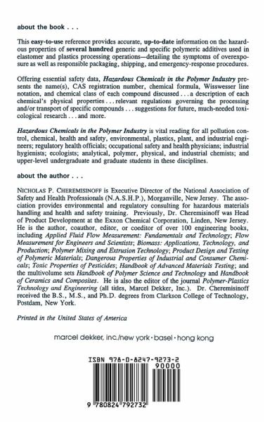 Provides accurate, up-to-date information on the hazardous properties of several hundred generic and specific polymeric additives used in elastomer and plastics processing operations, detailing the symproms of overexposure as well as resonsible packaging, shipping and emergency-response procedures. Essential safety data is offered.