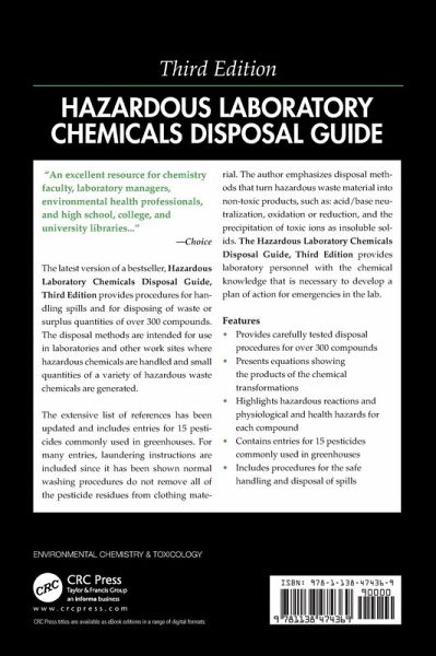 Includes entries for 15 pesticides used in greenhouses. This title places emphasis on disposal methods that turn hazardous waste material into non-toxic products. It provides data on hazardous reactions of chemicals, assisting laboratory managers in developing a plan of action for emergencies such as the spill of any of the chemicals listed.