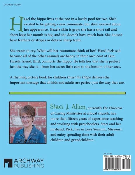 Hazel the hippo lives at the zoo in a lovely pool for two. She's excited to be getting a new roommate, but she's worried about her appearance. Hazel's skin is gray; she has a short tail and short legs; her mouth is big; and she doesn't have much hair. She doesn't have feathers or stripes or dots or sharp teeth. She wants to cry. What will her roommate think of her? Hazel feels sad because all of the other animals are happy in their own coat of skin. Hazel's friend, Bird, comforts the hippo. He tells her that she is perfect just the way she is-from her sweet little ears to the bottom of her toes. A rhyming picture book for children Hazel the Hippo delivers the important message that all kids and adults are perfect just the way they are.