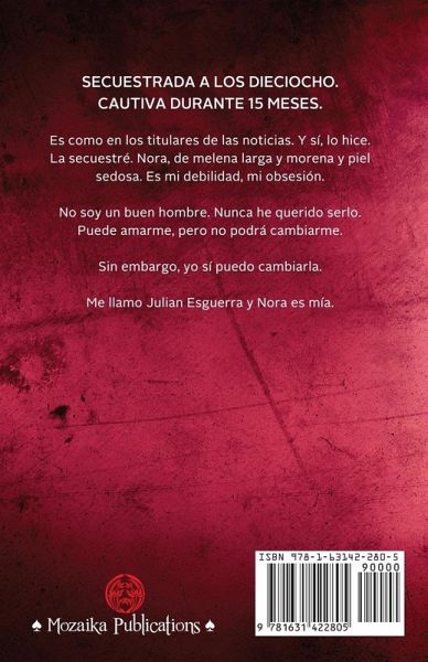 Secuestrada a los dieciocho. Cautiva durante 15 meses. Es como en los titulares de las noticias. Y sí, lo hice. La secuestré. Nora, de melena larga y morena y piel sedosa. Es mi debilidad, mi obsesión. No soy un buen hombre. Nunca he querido serlo. Puede amarme, pero no podrá cambiarme. Sin embargo, yo sí puedo cambiarla. Me llamo Julian Esguerra y Nora es mía.