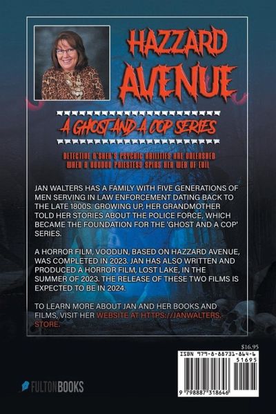 Jan Walters has a family with five generations of men serving in law enforcement dating back to the late 1800s. Growing up, her grandmother told her stories about the police force, which became the foundation for the 'Ghost and a Cop' series. A horror film, Voodun, based on Hazzard Avenue, was completed in 2023. Jan has also written and produced a horror film, Lost Lake, in the summer of 2023. The release of these two files is expected to be in 2024. To learn more about Jan and her books and films, visit her website at https://janwalters.store.