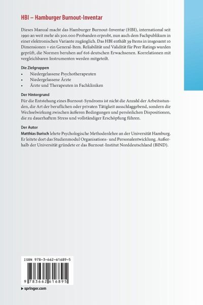 Vorwort und Danksagungen.- 1. Überblick über das Hamburger Burnout-Inventar (HBI).- 2. Theoretische Grundlagen und Anwendungszweck.- 3. Testkonstruktio.- 4. Psychometrische Eigenschaften.- 5. Auswertung und Normierung.- 6. Einsatz und Durchführung.- 7. Interpretation