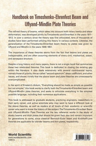 The refined theory of beams, which takes into account both rotary inertia and shear deformation, was developed jointly by Timoshenko and Ehrenfest in the years 1911–1912. In over a century since the theory was first articulated, tens of thousands of studies have been performed utilizing this theory in various contexts. Likewise, the generalization of the Timoshenko-Ehrenfest beam theory to plates was given by Uflyand and Mindlin in the years 1948–1951. The importance of these theories stems from the fact that beams and plates are indispensable, and are often occurring elements of every civil, mechanical, ocean, and aerospace structure. Despite a long history and many papers, there is not a single book that summarizes these two celebrated theories. This book is dedicated to closing the existing gap within the literature. It also deals extensively with several controversial topics, namely those of priority, the so-called "second spectrum" shear coefficient, and other issues, and shows vividly that the above beam and plate theories are unnecessarily overcomplicated. In the spirit of Einstein's dictum, "Everything should be made as simple as possible but not simpler," this book works to clarify both the Timoshenko-Ehrenfest beam and Uflyand-Mindlin plate theories, and seeks to articulate everything in the simplest possible language, including their numerous applications. This book is addressed to graduate students, practicing engineers, researchers in their early career, and active scientists who may want to have a different look at the above theories, as well as readers at all levels of their academic or scientific career who want to know the history of the subject. The Timoshenko-Ehrenfest Beam and Uflyand-Mindlin Plate Theories are the key reference works in the study of stocky beams and thick plates that should be given their due and remain important for generations to come, since classical Bernoulli-Euler beam and Kirchhoff-Love theories are applicable for slender beams and thin plates, respectively.