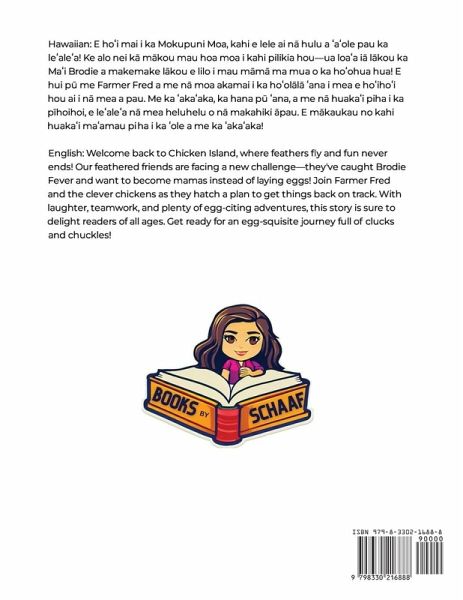Hawaiian: E ho¿i mai i ka Mokupuni Moa, kahi e lele ai n¿ hulu a ¿äole pau ka le¿ale¿a! Ke alo nei k¿ m¿kou mau hoa moa i kahi pilikia hou-ua loäa i¿ l¿kou ka Mäi Brodie a makemake l¿kou e lilo i mau m¿m¿ ma mua o ka ho¿ohua hua! E hui p¿ me Farmer Fred a me n¿ moa akamai i ka ho¿ol¿l¿ ¿ana i mea e ho¿iho¿i hou ai i n¿ mea a pau. Me ka ¿akäaka, ka hana p¿ ¿ana, a me n¿ huakäi piha i ka p¿hoihoi, e le¿ale¿a n¿ mea heluhelu o n¿ makahiki ¿pau. E m¿kaukau no kahi huakäi mäamau piha i ka ¿ole a me ka ¿akäaka! English: Welcome back to Chicken Island, where feathers fly and fun never ends! Our feathered friends are facing a new challenge-they've caught Brodie Fever and want to become mamas instead of laying eggs! Join Farmer Fred and the clever chickens as they hatch a plan to get things back on track. With laughter, teamwork, and plenty of egg-citing adventures, this story is sure to delight readers of all ages. Get ready for an egg-squisite journey full of clucks and chuckles!