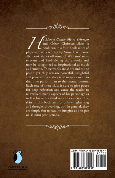 He Always Causes Me to Triumph by Samuel Williams is book number two in a four-book series of plays and skits. Much like book number four in this series, this book also contains several of Williams'very powerful and relevant Christian-based short dramatic works. Also, much like the offerings and impact of the book four contents, readers of this book are sure to be enlightened, entertained and nailed to their seats as Williams mesmerizes them with his unmatched ability to escort them along a magical yet very insightful journey which ultimates emerges them into the light of discovery and understanding and out of the shadows of the allogorical caves. Parents and students alike are highly encouraged to read every page of these short works and experience for themselves the hard-hitting didactic messages contained in each work. While this is only number two in a series of four books, I will prematurely endorse and highly recommend this series to anyone who wishes to read quality and thought provoking material that will cause him or her to earnestly selft evaluate then self correct. This series of books is an extemely powerful tool for any individual or group to maintain their possession at all times.