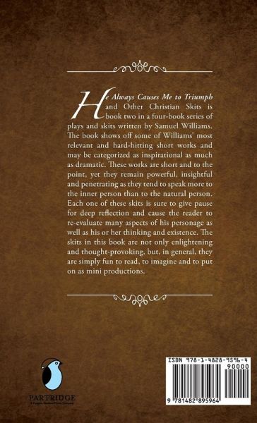 He Always Causes Me to Triumph by Samuel Williams is book number two in a four-book series of plays and skits. Much like book number four in this series, this book also contains several of Williams'very powerful and relevant Christian-based short dramatic works. Also, much like the offerings and impact of the book four contents, readers of this book are sure to be enlightened, entertained and nailed to their seats as Williams mesmerizes them with his unmatched ability to escort them along a magical yet very insightful journey which ultimates emerges them into the light of discovery and understanding and out of the shadows of the allogorical caves. Parents and students alike are highly encouraged to read every page of these short works and experience for themselves the hard-hitting didactic messages contained in each work. While this is only number two in a series of four books, I will prematurely endorse and highly recommend this series to anyone who wishes to read quality and thought provoking material that will cause him or her to earnestly selft evaluate then self correct. This series of books is an extemely powerful tool for any individual or group to maintain their possession at all times.