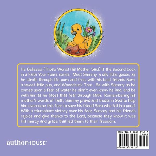 He Believed (Those Words His Mother Said) is the second book in a Faith Your Fears series. Meet Sammy, a silly little goose, as he strolls through life pure and free, with his best friends Sara, a sweet little pup, and Woodchuck Tom. Be with Sammy as he comes upon a fear of water he didn't even know he had, and be with him as he faces that fear through faith. Remembering his mother's words of faith, Sammy prays and trusts in God to help him overcome this fear to save his friend Sara who fell in a pond. With a triumphant victory over his fear, Sammy and his friends rejoice and give thanks to the Lord, because they know it was His mercy and grace that led them to their freedom.