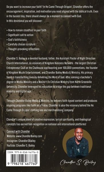 Do you want to increase your faith? In He Came Through Drippin', Chandler offers the encouragement, inspiration, and motivation you need aligning with the biblical truth. Even on the busiest day, there should always be a moment to connect with God. In this devotional you will discover: ¿ How to remain steadfast in your faith ¿ Significant call to action ¿ God's faithfulness ¿ Carefully chosen scripture ¿ Thought-provoking reflections ______________________________________________________________________________ Chandler S. Bailey is a devoted husband, father, accomplished Assistant Pastor at Right Direction Church International, co-visionary of Kingdom Business Network - the largest Christian Entrepreneur Club on the Clubhouse app boasting over 100,000 connections, the founder of Kingdom Muzik Entertainment, and Chandler Bailey Media. His primary focus is transforming lives by delivering the Word of God. After earning a bachelor's degree in Media Ministry and a Master's in Christian Ministry from North Greenville University Chandler leveraged his education to bridge the gap between traditional ministry and digital age. Through Chandler Bailey Media, he delivers faith-based content and produces inspiring programs like Faith on a Friday. Chandler is also the visionary behind the He Came Through Drippin' clothing line and merchandising company. Chandler's unique blend of creative expression, lyrical spirituality, and theological concepts has earned him recognition on national and international platforms! Connect with Chandler: Website: www.ChandlerBailey.com Instagram: ChandlerSBailey YouTube: Chandler S. Bailey