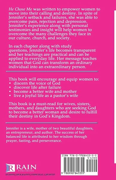 He Chose Me was written to empower women to move into their calling and destiny. In spite of Jennifer's setback and failures, she was able to overcome pain, rejection and depression. Jennifer's experience along with personal testimonies and insight will help women to overcome the many challenges they face in our culture, church and society. In each chapter along with study questions, Jennifer's life becomes transparent and her teachings are practical and can be applied to everyday life. Her message teaches women that God can transform an ordinary individual into an extraordinary person. This book will encourage and equip women to: discern the voice of God, discover life after failure, become a better wife and mother, and live a joyful life as a pastor's wife. This book is a must-read for wives, sisters, mothers and daughters who are seeking God to become a better woman and desire to fulfill their destiny in God's Kingdom.
