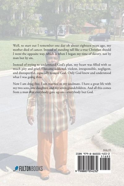 Well, to start out I remember one day oh about eighteen years ago, my mother died of cancer. Instead of standing tall like a true Christian should I went the opposite way, which is when I began my time of slavery, not by man but by sin. Instead of trying to understand God's plan, my heart was filled with so much pity and grief. I became addicted, violent, irresponsible, negligent, and disrespectful, especially toward God. Only God knew and understood what I was going thru. Now I am drug-free. I am married to my soulmate. I have a great life with my two sons, one daughter, and my seven grandchildren. And all this comes from a man that everybody gave up on--everybody but God.
