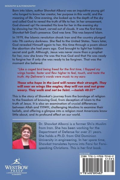 Born into Islam, author Showkat Alborzi was an inquisitive young girl who longed to know her creator, her purpose in this world, and the meaning of life. One evening, she looked up to the depth of the sky and called God to reveal the truth of life to her. In her amazement, God showed up! He revealed His love for her in the evening sky by showing her His heart, carved out of clouds. It was the first time Showkat felt God's presence. God was love. This was beyond Islam. In 1979, the Islamic revolution shook Iran and the country plunged into 7th century darkness. She fled to the United States. Years later, God revealed Himself again to her, this time through a poem about the abortion she had years ago. God brought to light her hidden secret and guilt. Although, Jesus was never more than a prophet for her, now she knew He was the true God and that He was ready to forgive her if only she was ready to be forgiven. That was the moment she believed. "Like a caged bird being freed for the first time, I flapped my wings harder, faster and flew higher to feel, touch, and taste the truth. My Deliverer's words were music to my ears: Those who hope in the Lord will renew their strength. They will soar on wings like eagles; they will run and not grow weary. They walk and not be faint. -Isaiah 40:31" This is the story of Showkat's journey from the bondage of religion to the freedom of knowing God, from deception of Islam to the truth of Jesus. It is also an examination of crucial differences between Allah and YHWH, challenging Muslims to examine their beliefs, and offering a glimpse into a religion most Americans know little about, and its profound effect on our world.