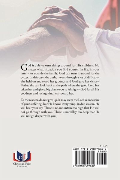 God is able to turn things around for His children. No matter what situation you find yourself in life, in your family, or outside the family, God can turn it around for the better. In this case, the author went through a lot of difficulty. She held on and stood her grounds and God gave her victory. Today, she can look back at the path where the good Lord has taken her and give a big thank-you to Almighty God for all His goodness and loving-kindness toward her. To the readers, do not give up. It may seem the Lord is not aware of your suffering, but He knows everything. In due season, He will hear your cry. There is no mountain too high that He will not go through with you. There is no valley too deep that He will not go deeper with you.