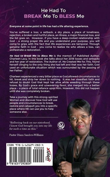 He Had to Break Me to Bless Me is the memoir of Published Author, Charleen Lacy. In this book she talks about her 2018 losses and setbacks and her year of restoration. The Author of, He Created Me for This, found herself clinging to the only thing she had left and that was her faith. God used an unfortunate situation which was surrounded by the passing of her Father. Charleen experienced a very bitter place as God allowed circumstances to hit, break and strip her down to nothing. It was her steadfast faith and refusal to doubt God that kept her alive while weeding through these losses. By God's grace and unwavering favor, she merged into a better place - a place of total reliance upon Him. However, this did not happen until she was completely broken. Take a journey with this strong-spirited Woman and discover how God will use people and circumstances to break, restore and catapult you into that place where HE can use you. Charleen Lacy is an ordained Prophetess. She is the founder of Charleen Lacy Ministries (CLM) and The Secret Place Prophetic Prayer Ministry, a published author of He Created Me For This, an associate minister of the Tabernacle MBC (Seattle), a singer, a mentor, and the full-time caregiver to her developmentally-delayed biological brother.