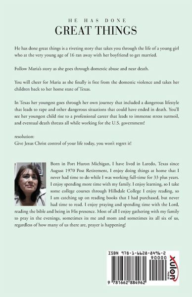 He has done great things is a riveting story that takes you through the life of a young girl who at the very young age of 16 ran away with her boyfriend to get married. Follow Maria's story as she goes through domestic abuse and near death. You will cheer for Maria as she finally is free from the domestic violence and takes her children back to her home state of Texas. In Texas her youngest goes through her own journey that included a dangerous lifestyle that leads to rape and other dangerous situations that could have ended in death. You'll see her youngest child rise to a professional career that leads to immense stress turmoil, and eventual death threats all while working for the U.S. government! resolution: Give Jesus Christ control of your life today, you won't regret it! Born in Port Huron Michigan, I have lived in Laredo, Texas since August 1970 Post Retirement, I enjoy doing things at home that I never had time to do while I was working full-time for 33 plus years. I enjoy spending more time with my family. I enjoy learning, so I take some college courses through Hillsdale College I enjoy reading, so I am catching up on reading books that I had purchased, but never had time to read. I enjoy praying and spending time with the Lord, reading the bible and being in His presence. Most of all I enjoy gathering with my family to pray in the evenings, sometimes its me and mom and sometimes its all six of us, regardless of how many of us there are, prayer is happening!