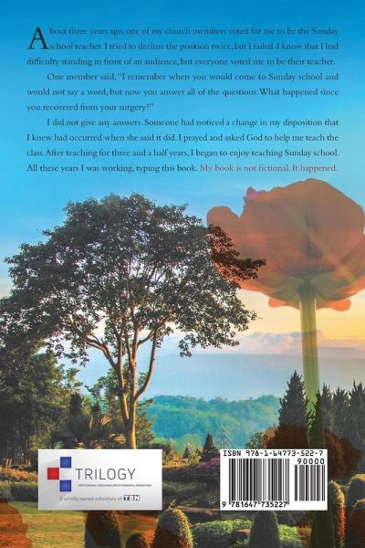 About three years ago, one of my church members voted for me to be the Sunday school teacher. I tried to decline the position twice, but I failed. I know that I had difficulty standing in front of an audience, but everyone voted me to be their teacher. One member said, "I remember when you would come to Sunday school and would not say a word, but now you answer all of the questions. What happened since you recovered from your surgery?" I did not give any answers. Someone had noticed a change in my disposition that I knew had occurred when she said it did. I prayed and asked God to help me teach the class. After teaching for three and a half years, I began to enjoy teaching Sunday school. All these years I was working, typing this book. My book is not fictional. It happened.