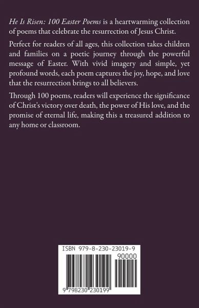 He Is Risen: 100 Easter Poems is a heartwarming collection of poems that celebrate the resurrection of Jesus Christ. Perfect for readers of all ages, this collection takes children and families on a poetic journey through the powerful message of Easter. With vivid imagery and simple, yet profound words, each poem captures the joy, hope, and love that the resurrection brings to all believers. Through 100 poems, readers will experience the significance of Christ's victory over death, the power of His love, and the promise of eternal life, making this a treasured addition to any home or classroom.