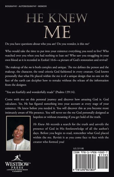 Do you have questions about who you are? Do you wonder, is this me? Who would take the time to put into your existence everything you need to live? Who watched over you when you had nothing to lean on? Who saw you struggling in your own blood as it is recorded in Ezekiel 16:6-a picture of God's restoration and revival? The makeup of the me is both complex and unique. The me defines the person and the makeup, the character, the total criteria God fashioned in every creature. God knows personally that what He placed within the me is of a unique design that no one on the face of the earth can decipher how to remake without the release of the information from the designer. "You are fearfully and wonderfully made" (Psalms 139:14). Come with me on this personal journey and discover how amazing God is. God calculates. Yes, He has figured something into your account at every stage of your existence. He knew before you needed it. You will discover this as you become more intimately aware of His presence. You will never see the me God personally designed as hopeless or without meaning if you get hold of the truth. He Knew Me records a search for the truth and unveils the presence of God in His foreknowledge of all the author's days. Before you begin to read, remember what God placed within the me. Revisit it as you come face to face with the creator who formed you!