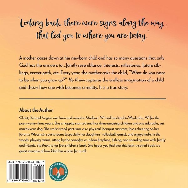 "Looking back, there were signs along the way...that led you to where you are today." A mother gazes down at her newborn child and has so many questions that only God has the answers to...family resemblance, interests, milestones, future siblings, career path, etc. Every year, the mother asks the child, "What do you want to be when you grow up?" He Knew captures the endless imagination of a child and shows how one wish becomes a reality. It is a true story.