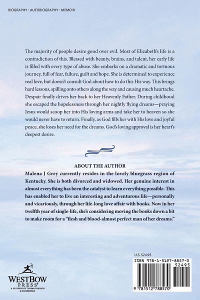 The majority of people desire good over evil. Most of Elizabeth’s life is a contradiction of this. Blessed with beauty, brains, and talent, her early life is filled with every type of abuse. She embarks on a dramatic and tortuous journey, full of fear, failure, guilt and hope. She is determined to experience real love, but doesn’t consult God about how to do this His way. This brings hard lessons, spilling onto others along the way and causing much heartache. Despair finally drives her back to her Heavenly Father. During childhood she escaped the hopelessness through her nightly flying dreams—praying Jesus would scoop her into His loving arms and take her to heaven so she would never have to return. Finally, as God fills her with His love and joyful peace, she loses her need for the dreams. God’s loving approval is her heart’s deepest desire.