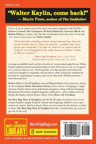 "Walter Kaylin, come back!" - Mario Puzo, author of THE GODFATHER "He looked like a divinity student, always buttoned up. Then the stories would come in. They were special ... seamless and outrageous and wonderful. I let him do whatever he wanted and he rarely, if ever, disappointed. He really deserves a tribute. I think of him as a treasure." - Bruce Jay Friedman (Stern, Lucky Bruce), Kaylin's editor at MEN, MALE, and TRUE ACTION Scores of great authors wrote for men's adventure magazines (aka MAMs)-Elmore Leonard, Jim Thompson, Richard Matheson, Lawrence Block, and Harlan Ellison, to name a few. But the wordsmith writers for MAN'S WORLD and TRUE ACTION envied most was Walter Kaylin. Leaving an indelible mark on three decades of sweat-soaked pulp fiction, Walter Kaylin tackled testosterone-fueled subjects from Westerns to war, secret agents to sex sirens, Nazis to noir. His frequently over-the-top plots and characters scaled new heights of ingenuity and invention, while setting the standard for the kind of unapologetic savagery and excess that made MAMs notorious-both then and now. Robert Deis of MensPulpMags.com and Wyatt Doyle (STOP REQUESTED), editors of the acclaimed Men's Adventure Library series, rescue a whopping 15 high-intensity Kaylin classics (16 in the expanded hardcover) from pulp fiction purgatory, along with jaw-dropping illustrations from their original magazine publication ... plus reminiscences by Kaylin, his family, and his former editor, writer Bruce Jay Friedman. HE-MEN, BAG MEN, & NYMPHOS rips the lid off pulp's best-kept secret to introduce Kaylin's unique brand of tension and tough-guy thrills to a new generation of readers. But be warned: These are not stories for the delicate, or faint of heart. HE-MEN, BAG MEN, & NYMPHOS hits like a clenched fist; get yours or get out of the way!