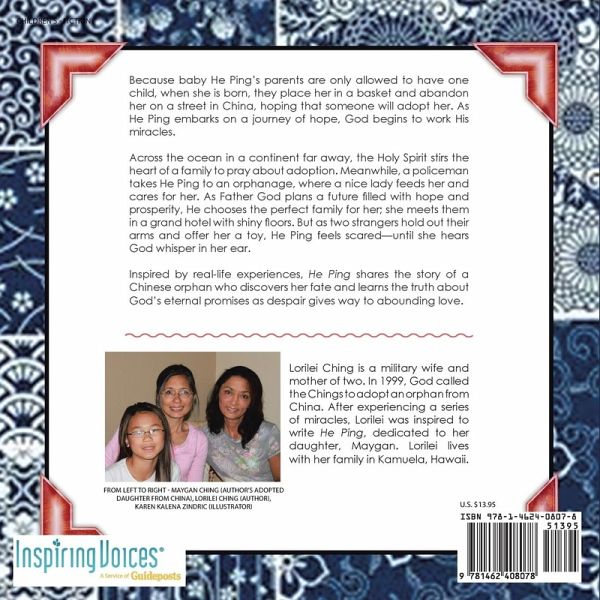 Because baby He Ping's parents are only allowed to have one child, when she is born, they place her in a basket and abandon her on a street in China, hoping that someone will adopt her. As He Ping embarks on a journey of hope, God begins to work His miracles. Across the ocean in a continent far away, the Holy Spirit stirs the heart of a family to pray about adoption. Meanwhile, a policeman takes He Ping to an orphanage, where a nice lady feeds her and cares for her. As Father God plans a future filled with hope and prosperity, He chooses the perfect family for her; she meets them in a grand hotel with shiny floors. But as two strangers hold out their arms and offer her a toy, He Ping feels scared-until she hears God whisper in her ear. Inspired by real-life experiences, He Ping shares the story of a Chinese orphan who discovers her fate and learns the truth about God's eternal promises as despair gives way to abounding love.