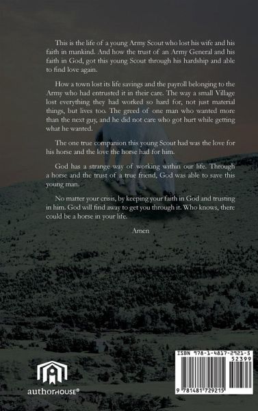 This is the life of a young Army Scout who lost his wife and his faith in mankind. And how the trust of an Army General and his faith in God, got this young Scout through his hardship and able to find love again. How a town lost its life savings and the payroll belonging to the Army who had entrusted it in their care. The way a small Village lost everything they had worked so hard for, not just material things, but lives too. The greed of one man who wanted more than the next guy, and he did not care who got hurt while getting what he wanted. The one true companion this young Scout had was the love for his horse and the love the horse had for him. God has a strange way of working within our life. Through a horse and the trust of a true friend, God was able to save this young man. No matter your crisis, by keeping your faith in God and trusting in him. God will find away to get you through it. Who knows, there could be a horse in your life. Amen