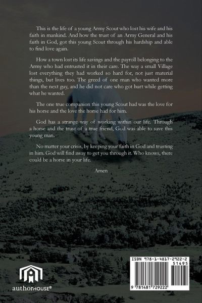 This is the life of a young Army Scout who lost his wife and his faith in mankind. And how the trust of an Army General and his faith in God, got this young Scout through his hardship and able to find love again. How a town lost its life savings and the payroll belonging to the Army who had entrusted it in their care. The way a small Village lost everything they had worked so hard for, not just material things, but lives too. The greed of one man who wanted more than the next guy, and he did not care who got hurt while getting what he wanted. The one true companion this young Scout had was the love for his horse and the love the horse had for him. God has a strange way of working within our life. Through a horse and the trust of a true friend, God was able to save this young man. No matter your crisis, by keeping your faith in God and trusting in him. God will find away to get you through it. Who knows, there could be a horse in your life. Amen