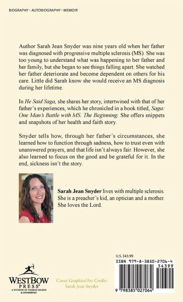 > In He Said Saga, she shares her story, intertwined with that of her father's experiences, which he chronicled in a book titled, Saga: One Man's Battle with MS. The Beginning. She offers snippets and snapshots of her health and faith story. Snyder tells how, through her father's circumstances, she learned how to function through sadness, how to trust even with unanswered prayers, and that life isn't always fair. However, she also learned to focus on the good and be grateful for it. In the end, sickness isn't the story.