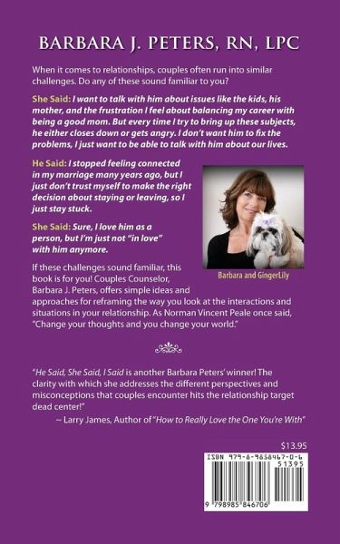 When it comes to relationships, couples often run into similar challenges. Do any of these sound familiar to you? She Said: I want to talk with him about issues like the kids, his mother, and the frustration I feel about balancing my career with being a good mom. But every time I try to bring up these subjects, he either closes down or gets angry. I don't want him to fix the problems, I just want to be able to talk with him about our lives. He Said: I stopped feeling connected in my marriage many years ago, but I just don't trust myself to make the right decision about staying or leaving, so I just stay stuck. She Said: Sure, I love him as a person, but I'm just not "in love" with him anymore. If these challenges sound familiar, this book is for you! Couples Counselor, Barbara J. Peters, offers simple ideas and approaches for reframing the way you look at the interactions and situations in your relationship. As Norman Vincent Peale once said, "Change your thoughts and you change your world."