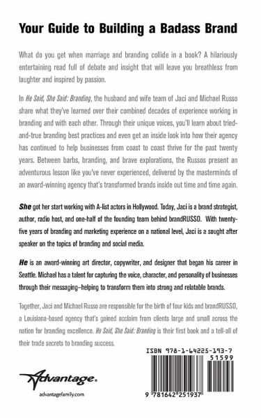 Your Guide to Building a Badass Brand. What do you get when marriage and branding collide in a book? A hilariously entertaining read full of debate and insight that will leave you breathless from laughter and inspired by passion. In He Said, She Said: Branding, the husband and wife team of Jaci and Michael Russo share what they've learned over their combined decades of experience working in branding and with each other. Through their unique voices, you'll learn about tried-and- true branding best practices and even get an inside look into how their agency has continued to help businesses from coast to coast thrive for the past twenty years. Between barbs, branding, and brave explorations, the Russos present an adventurous lesson like you've never experienced, delivered by the masterminds of an award-winning agency that's transformed brands inside out time and time again.
