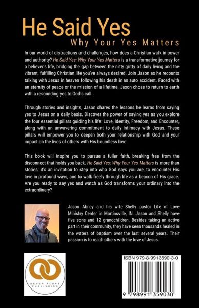 In our world of distractions and challenges, how does a Christian walk in power and authority? He Said Yes: Why Your Yes Matters is a transformative journey for a believer's life, bridging the gap between the nitty gritty of daily living and the vibrant, fulfilling Christian life you've always desired. Join Jason as he recounts talking with Jesus in heaven following his death in an auto accident. Faced with an eternity of peace or the mission of a lifetime, Jason chose to return to earth with a resounding yes to God's call.
