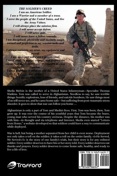 Sheila Melvin is the mother of a United States Infantryman-Specialist Thomas Watkins. Tom was called to serve in Afghanistan. Needless to say, he saw terrible things: horrific explosions, loss of friends, and suicide bombers. He saw things most of us will never see, and he came home safe-but suffering from post-traumatic stress disorder. It goes to show that war can follow you home ... Afghanistan is only a part of Tom and Sheila's lives. First, Tom was born; then, Tom grew up. It was over the course of his youthful years that Tom became the brave, young man who served his country overseas. Despite the distance, his mother was with him-in thought and via telephone and Internet. Sheila even started "Letters from Home," a website developed so that soldiers could have a way to communicate while deployed. War is hell, but being a mother separated from her child is even worse. Deployment not only takes a toll on the soldier; it takes a toll on the entire family. He Served, We Served is the story of one family's trials, but their story is for any enlisted soldier. Every soldier deserves to have his or her story told. Every soldier deserves our thanks and prayers. Every solder deserves to come home safe, healthy, and ready to live a life of love.