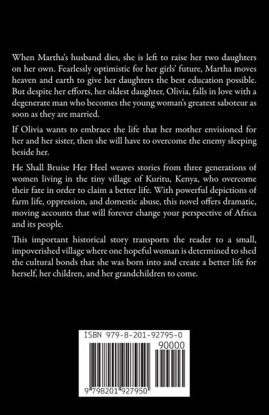 When Martha's husband dies, she is left to raise her two daughters on her own. Fearlessly optimistic for her girls' future, Martha moves heaven and earth to give her daughters the best education possible. But despite her efforts, her oldest daughter, Olivia, falls in love with a degenerate man who becomes the young woman's greatest saboteur as soon as they are married. If Olivia wants to embrace the life that her mother envisioned for her and her sister, then she will have to overcome the enemy sleeping beside her. He Shall Bruise Her Heel weaves stories from three generations of women living in the tiny village of Kuritu, Kenya, who overcome their fate in order to claim a better life. With powerful depictions of farm life, oppression, and domestic abuse, this novel offers dramatic, moving accounts that will forever change your perspective of Africa and its people. This important historical story transports the reader to a small, impoverished village where one hopeful woman is determined to shed the cultural bonds that she was born into and create a better life for herself, her children, and her grandchildren to come.