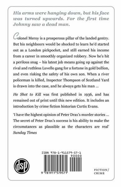 His arms were hanging down, but his face was turned upwards. For the first time Johnny saw a dead man. Colonel Meroy is a prosperous pillar of the landed gentry. But his neighbours would be shocked to learn he’d started out as a London pickpocket, and still earns his income from a career in smoothly organized robbery. Now he’s hit a perilous snag – his latest job means going up against the rival and ruthless Luvello gang for a fortune in gold bullion, and even risking the safety of his own son. When a river policeman is killed, Inspector Thompson of Scotland Yard is drawn into the case, and he always gets his man … He Shot to Kill was first published in 1936, and has remained out of print until this new edition. It includes an introduction by crime fiction historian Curtis Evans. ‘I have the highest opinion of Peter Drax’s murder stories … The secret of Peter Drax’s success is his ability to make the circumstances as plausible as the characters are real’ Sunday Times
