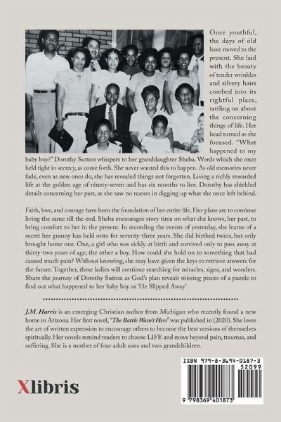 Once youthful, the days of old have moved to the present. She laid with the beauty of tender wrinkles and silvery hairs combed into its rightful place, rattling on about the concerning things of life. Her head turned as she focused. "What happened to my baby boy?" Dorothy Sutton whispers to her granddaughter Sheba. Words which she once held tight in secrecy, as come forth. She never wanted this to happen. As old memories never fade, even as new ones do, she has revealed things not forgotten. Living a richly rewarded life at the golden age of ninety-seven and has six months to live. Dorothy has shielded details concerning her past, as she saw no reason in digging up what she once left behind. Faith, love, and courage have been the foundation of her entire life. Her plans are to continue living the same till the end. Sheba encourages story time on what she knows, her past, to bring comfort to her in the present. In recording the events of yesterday, she learns of a secret her granny has held onto for seventy-three years. She did birthed twins, but only brought home one. One, a girl who was sickly at birth and survived only to pass away at thirty-two years of age, the other a boy. How could she hold on to something that had caused much pain? Without knowing, she may have given the keys to retrieve answers for the future. Together, these ladies will continue searching for miracles, signs, and wonders. Share the journey of Dorothy Sutton as God's plan reveals missing pieces of a puzzle to find out what happened to her baby boy as 'He Slipped Away'.