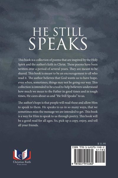 This book is a collection of poems that are inspired by the Holy Spirit and the author's faith in Christ. These poems have been written over a period of several years. They are meant to be shared. This book is meant to be an encouragement to all who read it. The author believes that God wants us to have hope, even when, sometimes, things may not be going our way. This collection is intended to be a tool to help believers understand how much we mean to the Father in good times and in tough times, He cares about us and "He Still Speaks" to us. The author's hope is that people will read these and allow Him to speak to them. He speaks to us in so many ways, that we sometimes miss the message we are intended to get. This book is a way for Him to speak to us through poetry. This book will be a good read for all ages. So, pick up a copy, enjoy, and tell all your friends.