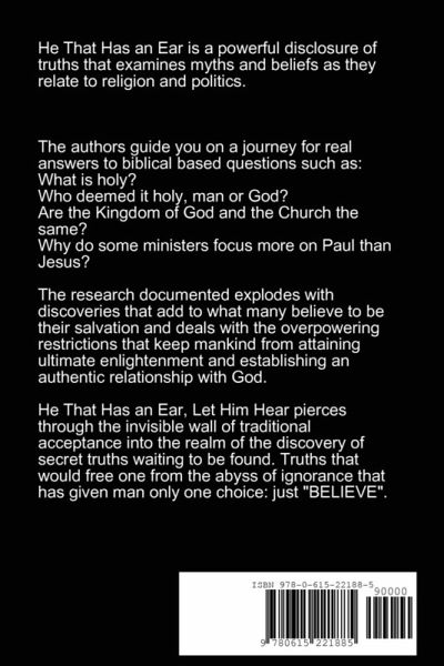 This book goes beyond the ¿Law of Attraction¿ and explodes with factual discoveries about man's relationship with God, the universe and what we have been lead to believe about them. Like never before, become empowered by this ¿Quantum Door Experience¿. The connection between religion and politics has never been more clearly defined. The authors take you on a journey across the globe through an examination of religions in search of missing pieces to what many have simply excused as information that was never intended to be found. Is quantum manifestation important to you? ¿HE THAT HAS AN EAR, LET HIM HEAR¿ provides you with straight talk and touches on true replicable experiments on how to immediately manifest the things you want. So if you are up for a fact finding journey that will lead you to greater clarity of religion and spirituality, then read ¿HE THAT HAS AN EAR, LET HIM HEAR.¿