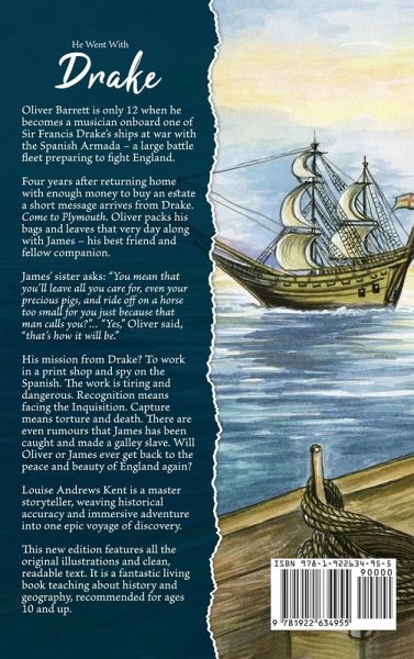 Oliver Barrett is only 12 when he becomes a musician onboard one of Sir Francis Drake's ships at war with the Spanish Armada - a large battle fleet preparing to fight England. Four years after returning home with enough money to buy an estate a short message arrives from Drake. Come to Plymouth. Oliver packs his bags and leaves that very day along with James - his best friend and fellow companion. James' sister asks: "You mean that you'll leave all you care for, even your precious pigs, and ride off on a horse too small for you just because that man calls you?"... "Yes," Oliver said, "that's how it will be." His mission from Drake? To work in a print shop and spy on the Spanish. The work is tiring and dangerous. Recognition means facing the Inquisition. Capture means torture and death. There are even rumours that James has been caught and made a galley slave. Will Oliver or James ever get back to the peace and beauty of England again? Louise Andrews Kent is a master storyteller, weaving historical accuracy and immersive adventure into one epic voyage of discovery. This new edition features all the original illustrations and clean, readable text. It is a fantastic living book teaching about history and geography, recommended for ages 10 and up.