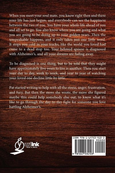 BOOK SUMMARY/SYNOPSIS: When you meet your soul mate, you know right then and there your life has just begun, and everybody can see the happiness between the two of you. You have your whole life ahead of you and all set to go. You also know where you are going and what you are going to be doing up to your golden years. Then the unspeakable happens, and it only takes just one little word. It stops you cold in your tracks, like the world you loved had come to a dead stop too. Your beloved spouse is diagnosed with Alzheimer's, and all your dreams are fading away. To be diagnosed is one thing, but to be told that they might have approximately five years to live is another. Then you start your day to day, week to week, and year to year of watching your loved one decline little by little. Pat started writing to help with all the stress, anger, frustration, and fury. But then the more she wrote, the more she figured maybe this could help somebody else out, to know what it's like to go through the day-to-day fight for someone you love battling Alzheimer's.
