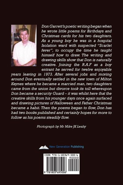 Don Garrett's poetic writing began when he wrote little poems for Birthdays and Christmas cards for his two daughters. As a young boy he was in a hospital Isolation ward with suspected "Scarlet fever", to occupy the time he taught himself how to draw. The writing and drawing skills show that Don is naturally creative. Joining the R.A.F as a boy entrant he served for twelve enjoyable years leaving in 1973. After several jobs and moving around Don eventually settled in the new town of Milton Keynes where he became a married man, two daughters came from the union but divorce took its toll…mehr