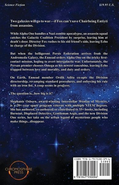 Two galaxies will go to war—if Fox can’t save Chairbeing Entiyti from assassins. While Alpha One handles a Nazi zombie apocalypse, an assassin squad catches the Galactic Coalition President by surprise, leaving him at death’s door. Director Fox rushes to his old friend’s side, leaving Echo in charge of the Division. But when the belligerent Persis Federation arrives from the Andromeda Galaxy, the Ennead orders Alpha One on the tricky first-contact mission, hoping to avert intergalactic war. Unfortunately, the Persan premier chooses Omega as his newest concubine, leaving Echo trapped between love and morality, and duty and orders. On Earth, Ennead member Ordik Adita co-opts the Division directorship, revamping standard procedures, and enforcing his rule with an iron fist. A coup seems in progress. The question is...how big is it?
