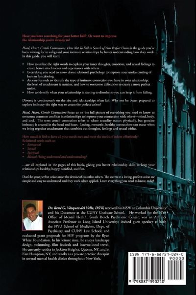 Head, Heart, Crotch Connections: How Not to Fail in Search of Your Perfect Union is a self-help book in relational psychology written to help readers explore the nature of mind, body, spirit connections in their relationships, the type of intimate connection they have, the level of attachment it sustains, and how to overcome the difficulties that come with creating a more perfect union. It is a guide designed to safeguard your intimate relationship by better understanding how to connect: mentally, emotionally and physically. It offers insights into how connections actually occur and how to prevent the demise of those connections. The writer provides case examples from his clinical practice which exemplify the way relationships can flourish or fail to thrive. The book explains: what head, heart, crotch connections imply what are the 6 W's of connection how to identify when a relationship is starting to dissolve how to overcome disconnections how trauma affects connections how not all connections are created equal provides an easy formula to identify the type of intimate connection you have in your relationship finally how to achieve a better head, heart, crotch connection. The ultimate goal being how to "succeed", and specifically "How Not to Fail" in search of a union that is particularly perfect for you.
