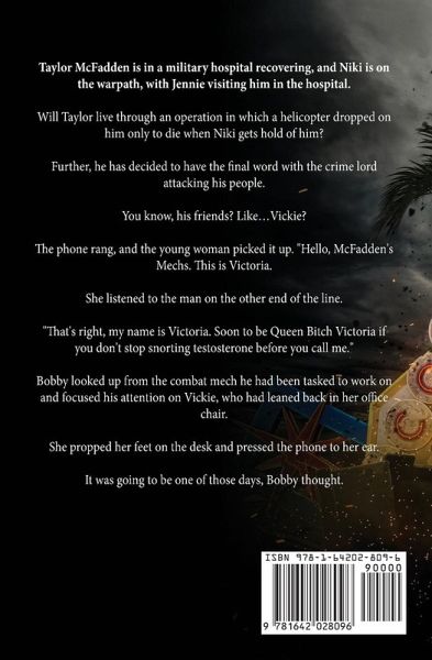 Taylor McFadden is in a military hospital recovering, and Niki is on the warpath, with Jennie visiting him in the hospital. Will Taylor live through an operation in which a helicopter dropped on him only to die when Niki gets hold of him? Further, he has decided to have the final word with the crime lord attacking his people. You know, his friends? Like...Vickie? The phone rang, and the young woman picked it up. "Hello, McFadden's Mechs. This is Victoria. She listened to the man on the other end of the line. "That's right, my name is Victoria. Soon to be Queen Bitch Victoria if you don't stop snorting testosterone before you call me." Bobby looked up from the combat mech he had been tasked to work on and focused his attention on Vickie, who had leaned back in her office chair. She propped her feet on the desk and pressed the phone to her ear. It was going to be one of those days, Bobby thought. The only person Niki might be more upset with is anyone who attacks her family. Now, she has one other person who ranks higher than Taylor on her shit list. Will she support Taylor when he decides to go for the guy at the top? Go up and click Buy Now or Read for Free and join Tyalor as he is done being 'Mr. Nice Guy.'