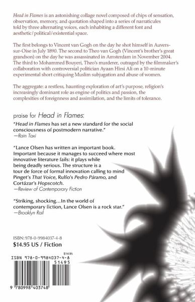 Head in Flames is an astonishing collage novel composed of chips of sensation, observation, memory, and quotation shaped into a series of narraticules told by three alternating voices, each inhabiting a different font and aesthetic / political / existential space. The first belongs to Vincent van Gogh on the day he shot himself in Auverssur-Oise in July 1890. The second to Theo van Gogh (Vincent's brother's great grandson) on the day he was assassinated in Amsterdam in November 2004. The third to Mohammed Bouyeri, Theo's murderer, outraged by the filmmaker's collaboration with controversial politician Ayaan Hirsi Ali on a 10-minute experimental short critiquing Muslim subjugation and abuse of women. The aggregate: a restless, haunting exploration of art's purpose, religion's increasingly dominant role as engine of politics and passion, the complexities of foreignness and assimilation, and the limits of tolerance.
