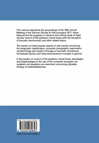 The 28th annual conference of the German Society for Neurosurgery was held in Cologne, West Germany, from the 18th to the 21st of September 1977. The conference dealt with problems concerning craniocerebral injuries and space-occupying processes in the posterior cranial fossa as well as general topics on clinical practice and research with special attention paid to the work of younger neurosurgeons. This volume is a presentation of the conference results. Within the scope of the general topics, special interest was directed toward the que stion of the current status of cytostatic treatment for brain tumors. In addition to experimental investigations, the results concerning cerebral tumors and medulloblas tomas are reported. Cerebellar tumors represent two further focal points: 1. From the diagnostic viewpoint, specific results from computerized tomography are discussed, especially with regard to the more extensive anatomic difficulties involved in the posterior cranial fossa. 2. With emphasis on cerebellar processes, the results of long-term measurements of intracranial pressure during the postoperative follow-up period are reported.