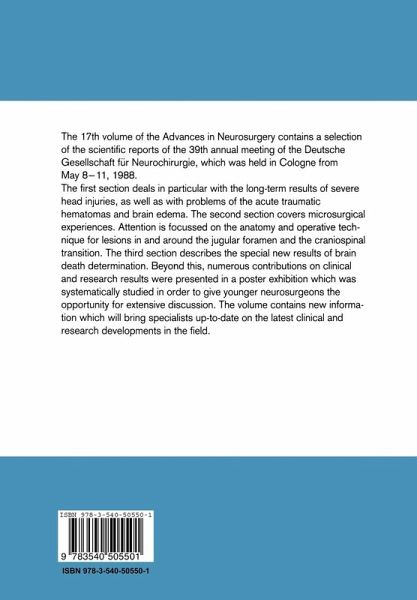 The 17th volume of the "Advances in Neurosurgery" contains a selection of the scientific reports of the 39th annual meeting of the German Society for Neurosurgery, which was held in Cologne from May 8-11, 1988. The first section deals in particular with the long-term results of severe head  injuries, as well as with problems of the acute traumatic hematomas and brain edema. The second section covers microsurgical experiences. Attention is focused on the anatomy and operative technique for lesions in and around the jugular foramen and the craniospinal transition. The third section describes the special new results of brain  death determination. Beyond this, numerous contributions on clinical and research results were presented in a poster exhibition which was systematically studied in order to give younger neurosurgeons the opportunity for extensive discussion. The volume contains new information which will bring specialists up-to-date on the latest clinical and research developments in the field.