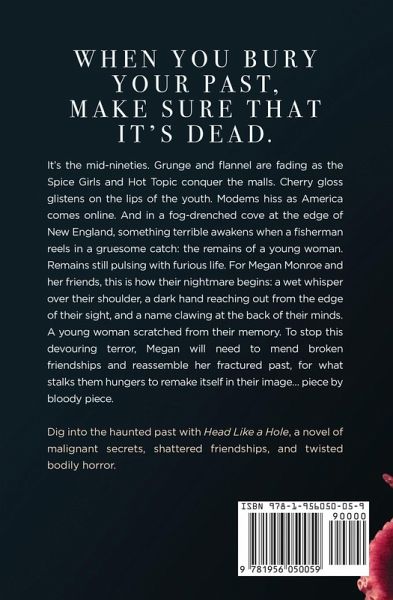 When you bury your past, make sure that it's dead. It's the mid-nineties. Grunge and flannel are fading as the Spice Girls and Hot Topic conquer the malls. Cherry gloss glistens on the lips of the youth. Modems hiss as America comes online. And in a fog-drenched cove at the edge of New England, something terrible awakens when a fisherman reels in a gruesome catch: the remains of a young woman. Remains still pulsing with furious life. For Megan Monroe and her friends, this is how their nightmare begins: a wet whisper over their shoulder, a dark hand reaching out from the edge of their sight, and a name clawing at the back of their minds. A young woman scratched from their memory. To stop this devouring terror, Megan will need to mend broken friendships and reassemble her fractured past, for what stalks them hungers to remake itself in their image... piece by bloody piece. Dig into the haunted past with Head Like a Hole, a novel of malignant secrets, shattered friendships, and twisted bodily horror.
