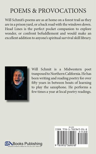 This book is a collection of poetry which becomes a 60 Day Devotional to Personal Psalmistry. Will Schmit's poems are as at home on a forest trail as they are in a prison yard, or a back road with the windows down. Head Lines is the perfect pocket companion to explore wonder, or confront befuddlement and would make a perfect addition to anyone's spiritual survival skill library.